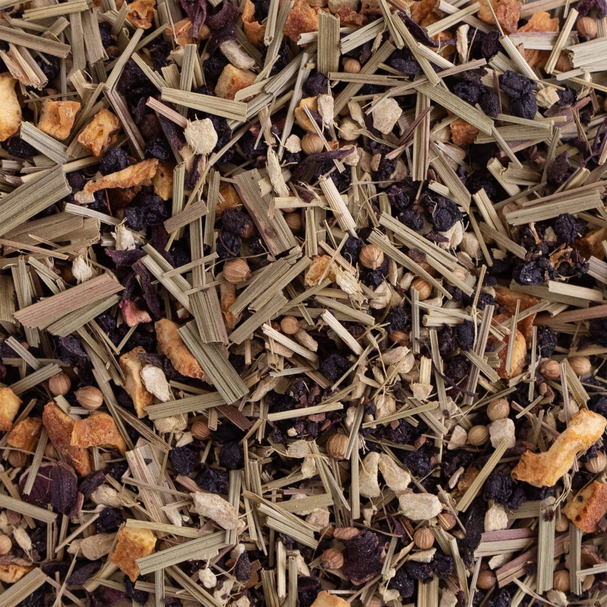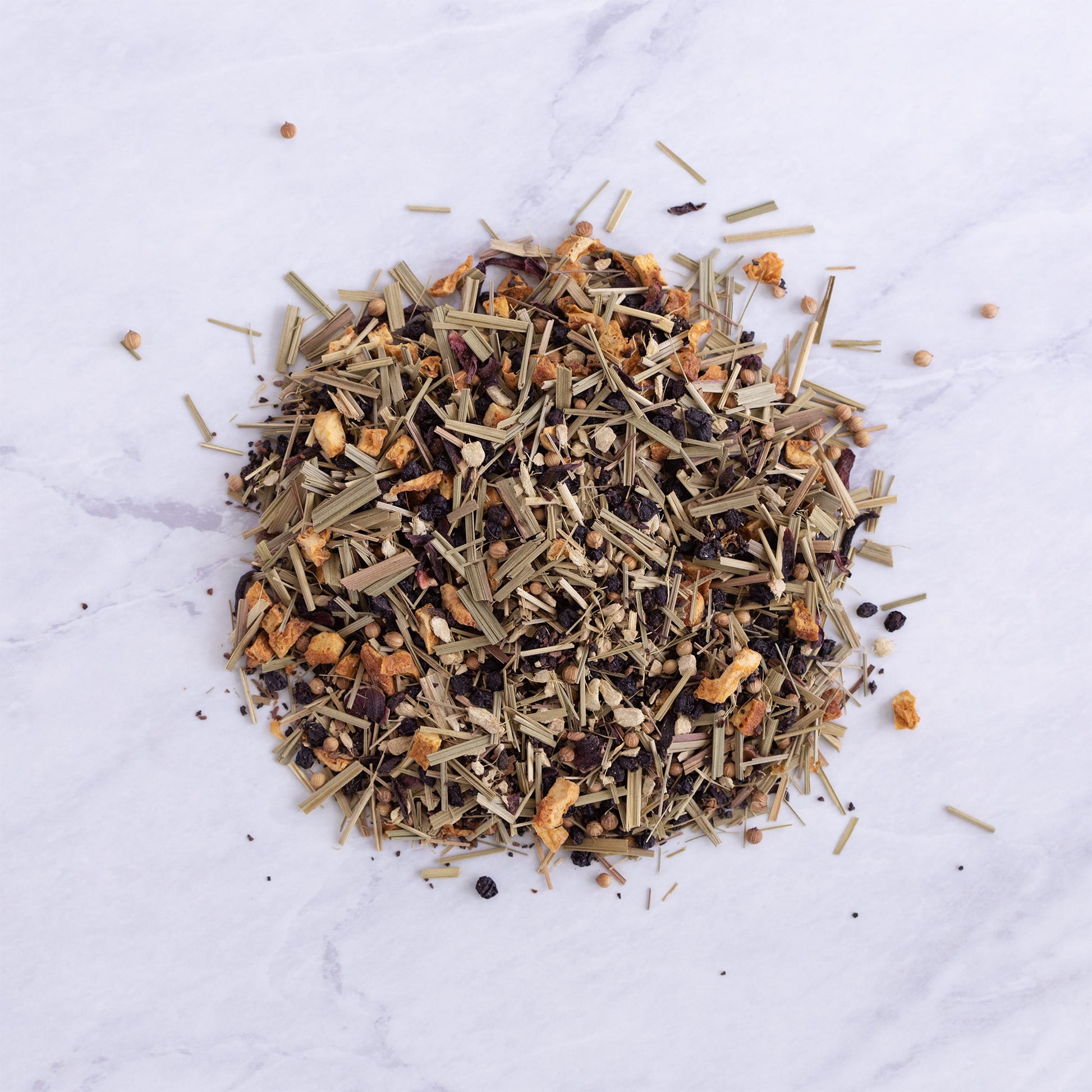 A lovely, caffeine-free herbal blend with top notes of elderberry, lemon, and ginger with just a touch of cinnamon. Fragrant and comforting. Two sizes available: 1.5 oz. (about 16 tsp) and 3 oz. (about 32 tsp). Available with or without an infuser.